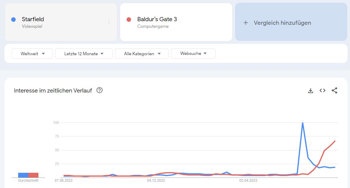 What about Germany? In Germany, the interest in Baldur’s Gate 3 has surged compared to Starfield more significantly than the global average: Here in Germany, Baldur’s Gate 3 has even surpassed the peak hype of Starfield before its release.