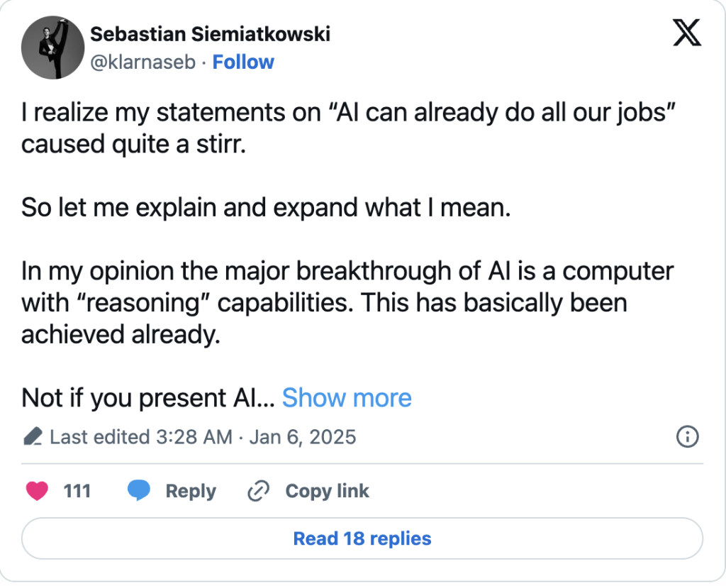 On January 6, 2025, Siemiatkowski then published a post on the platform X (formerly Twitter), where he clarified his previous statements: “I am aware that my statement ‘AI can already take over all our jobs’ has caused a stir. Let me clarify: ‘Let me explain and elaborate what I mean’.”.