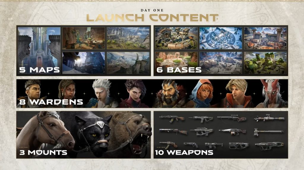 At launch, there are 5 maps with 6 bases, 8 different playable characters, 3 mounts, and 10 weapons. Additional content is set to come into the game in “episodes.” In a few weeks, a new Warden and a ranked mode are also expected to be added.