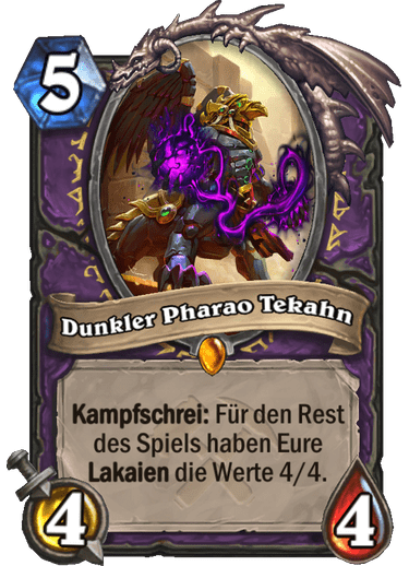 In addition, Warlocks will receive their legendary minion, Dark Pharaoh Tekahn. This costs 5 Mana and has stats of 4/4. However, his Battlecry makes him really useful in conjunction with Lackeys, as these minions will have stats of 4/4 for the rest of the game. This makes it worthwhile for Warlocks to invest in small Lackeys, which otherwise only have stats of 1/1.