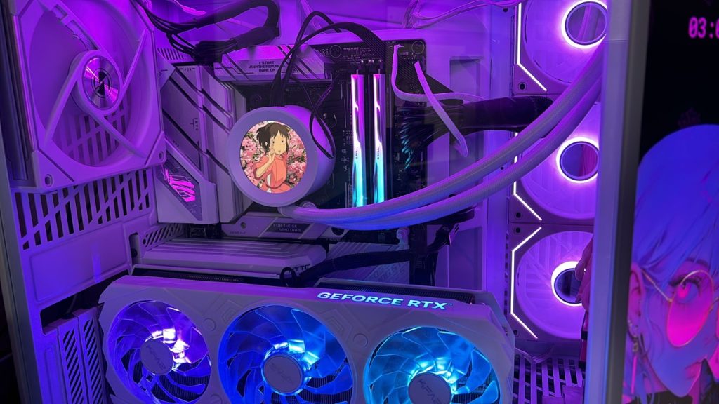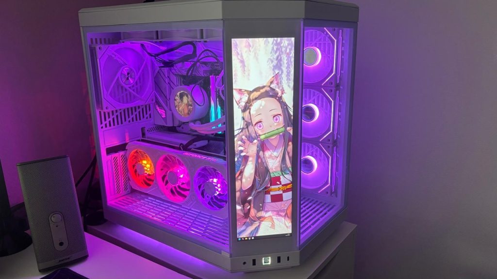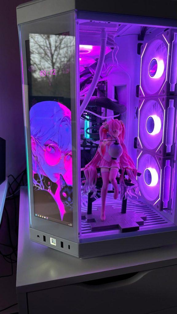For me, it was important that the PC lights up as colorfully as possible and shows what a big anime fan I am. That’s why I decided to install a CPU cooler on which I can project an image. The tower also has a touchpad where I can set a background with icons as I like.