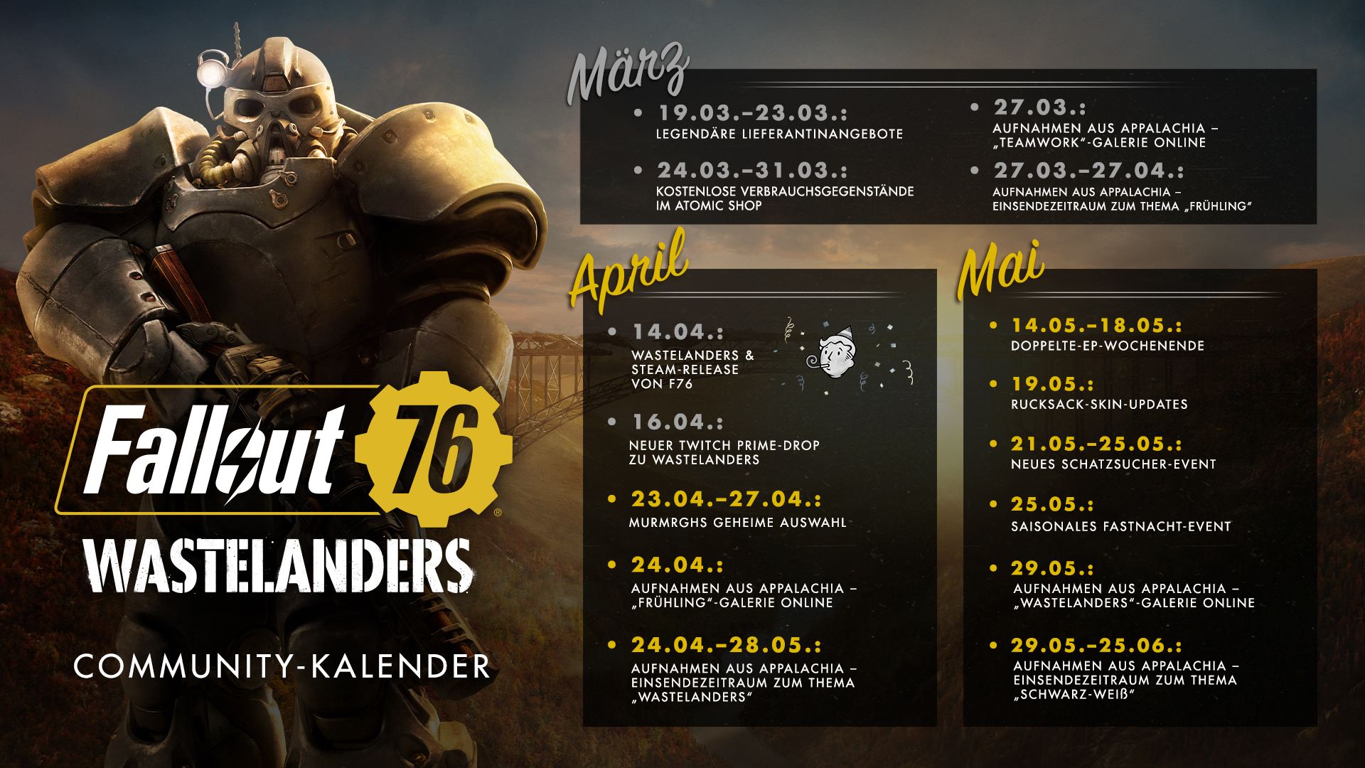 Außerdem erhaltet ihr laut des Community-Kalenders gleichzeitig mit dem Free-Weekend doppelte Erfahrungspunkte in Fallout 76. Ihr habt also die Möglichkeit, in Wastelanders einzusteigen und gleich ordentlich zu leveln, um auch etliche der neuen Features zu testen.