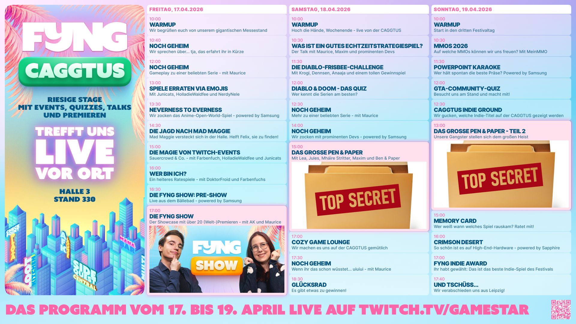 Unser Show-Programm könnt ihr entweder live vor Ort in Leipzig oder auf unserem GameStar-Twitch-Kanal verfolgen oder natürlich auch hier auf eurer Lieblings-Website. Die FYNG CAGGTUS Show 2026 am Donnerstag übertragen wir außerdem auf dem GameStar-YouTube-Kanal. Das sind unsere Sendezeiten: