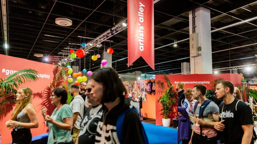 Im Untergeschoss von Halle 5.1 ist die artist area, die Künstlermeile der gamescom 2025. Hier erhalten zahlreiche Künstlerinnen und Künstler die Möglichkeit, live ihre Werke dem Publikum zu präsentieren.