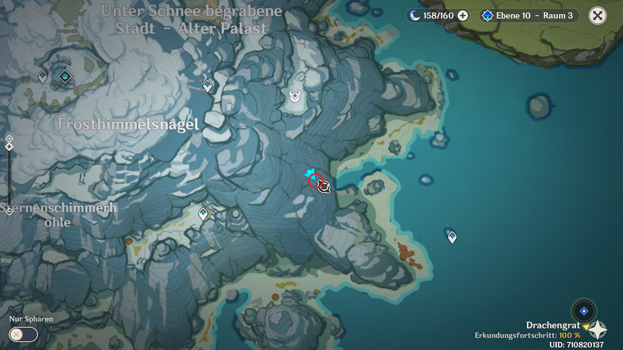 - 1. Versteck: Truhe mit 2x lila EP-Kärtchen und 20.000 Mora.