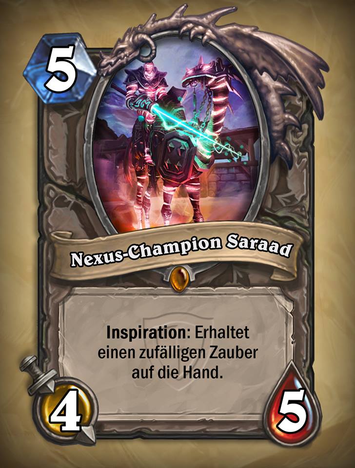 Platz 3: Nexus-Champion Saraad belegt meinen Platz 3. Er hat zwar einen hohen Zufallsfaktor, weil es einen vollkommen zufälligen Zauber auf die Hand gibt – aber mehr Zauber sind immer besser, nicht wahr? Mit seinen Werten von 4/5 für 5 Mana ist er auch immer noch “ganz okay” um einen 5-Mana-Platz im Deck zu belegen und gespielt zu werden, wenn man gerade keine anderen Optionen hat. Zieht man dann noch 1-2 Zauber aus ihm, womöglich sogar richtig starke wie Gleichheit, Feuerball oder Ähnliches, sehe ich schon vor mir, wie selbst Rushdecks Saraad mitnehmen, nur um für den Fall der Fälle vorzusorgen.
