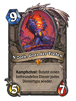 Zuletzt wird der legendäre Diener N’Zoth, Gott der Tiefen gestärkt. Seine Manakosten sinken von 10 Mana auf 9 Mana. Damit ist er bereits früher im Mid-Game spielbar oder erlaubt, nach seinem Ausspielen noch weitere Karten zu verwenden.