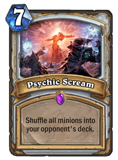 Für Priester winkt ein weiterer Bordclear. Für 7 Mana gibt es den Zauber Psychic Scream. Dieser entfernt alle Diener auf dem Spielbrett und mischt sie in das Deck des Gegners – auch die Diener des Priesters. Psychic Scream ist somit der erste, vollständig aufräumende Flächenzauber, der die Todesröcheln-Mechaniken der Karten komplett umgehen kann.