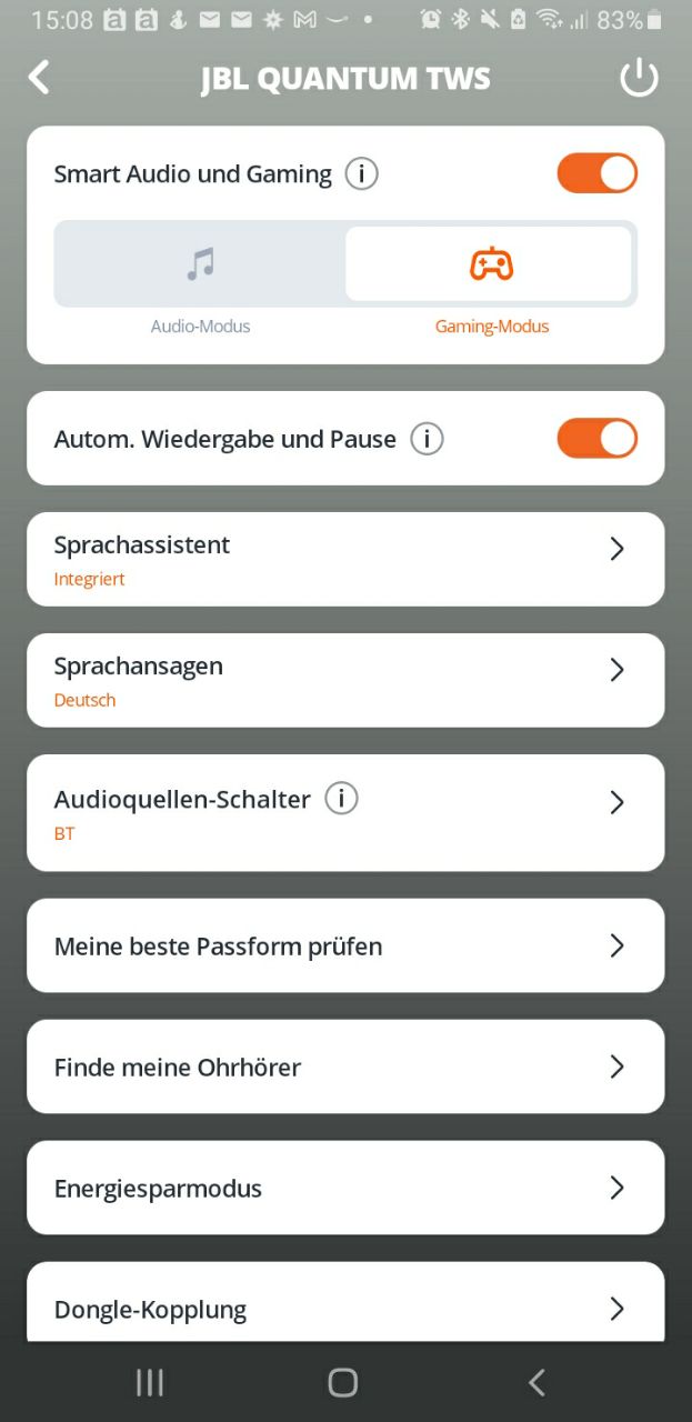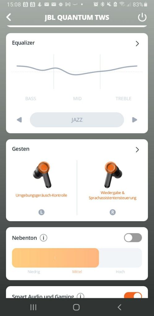 App und Interface: Für die In-Ears kommt die „JBL Headphones“-App zum Einsatz. Beim Start der App gibt es eine sehr schnelle Abfolge von Bildern, was sich nicht überspringen lässt.