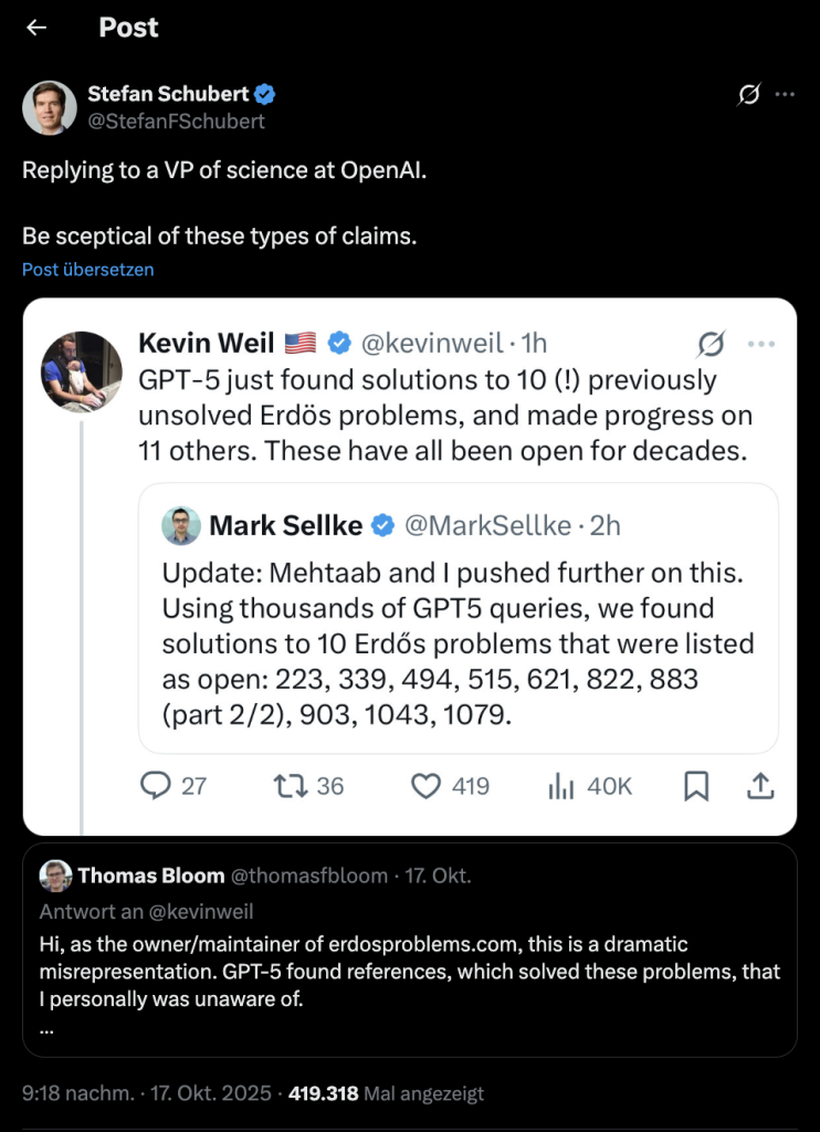 Im Anschluss behauptete der Produktmanager von OpenAI, Kevin Weil, dass GPT 5 „10 offene Paul-Erdős-Probleme gelöst“ und bei weiteren 11 signifikante Fortschritte erzielt habe.