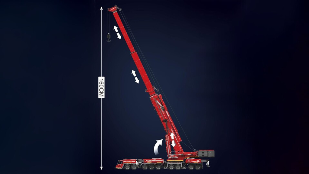 Der Mould King 17008 Schwerlastkran beeindruckt auf ganzer Linie. Im voll ausgefahrenen Zustand erreicht das Modell eine Höhe von 1,6 Metern und bietet eine auf dem Maßstab bisher unerreichte Funktionalität. Dank neun Achsen, von denen sieben per Fernsteuerung gelenkt werden, steht der Kran stabil und ist gleichzeitig erstaunlich beweglich.