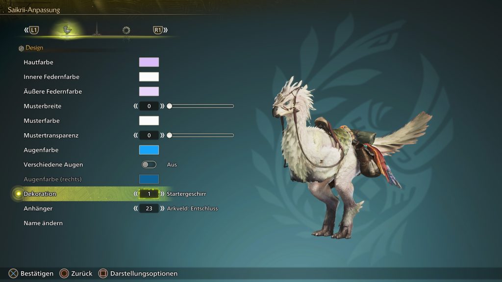 Danach könnt ihr bei ihr oder in eurem Zelt, wenn ihr den letzten Reiter anwählt, euren Saikrii individualisieren und färben.