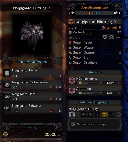 Welche Belohnungen gibt es? Für das Erlegen des kampfgehärteten Nergigante erhaltet ihr Materialien, mit denen ihr das Nergigante-Gamma-Set schmieden könnt.