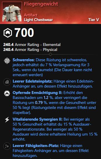 | Fliegengewicht | Leicht | Ner’Mur – Boss in Elysian Wilds | – Diese Rüstung ist schwerelos, jedoch erhältst du 7 % Verlangsamung für 3 Sek., wenn du taumelst (Die Dauer kann nicht erneuert werden) – Erhöht den Basisschaden um 1.2 %, aber verringert die Rüstung um 0.79 %, wenn die Gesundheit unter 50 % liegt (Rüstungsteile mit diesem Effekt sind stapelbar). – Bei weniger als 50 % Gesundheit erhältst du 15 % Ausdauer-Regenerationsrate. Bei weniger als 50 % Ausdauer wird deine erhaltene Heilung um 15 % erhöht. |