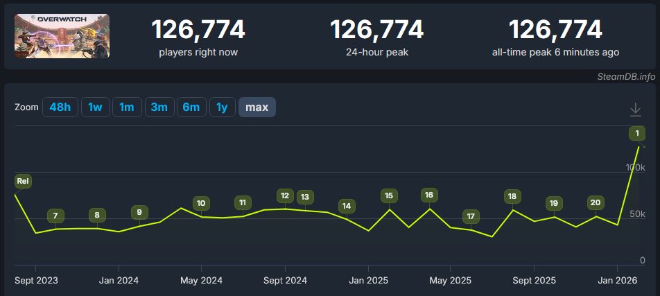 Über 126.000 Leute sind laut SteamDB aktuell gleichzeitig in Overwatch eingeloggt – Tendenz steigend. Das ist der absolute Höchstwert seit dem Steam-Launch im August 2023.