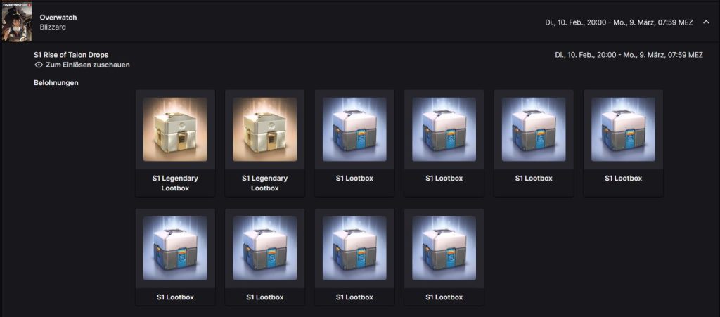 Passend zum Start von Season 1 gibt es neue Twitch-Drops für Overwatch. Dafür müsst ihr einfach einen Twitch-Kanal öffnen, der in der Overwatch-Kategorie livestreamt, und eine gewisse Anzahl an Stunden (0,5 – 13) zuschauen: