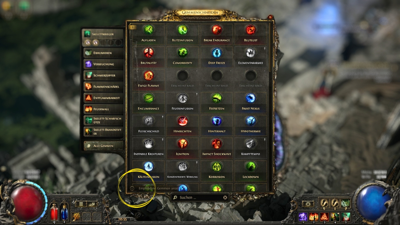 - Flammenschädel (ihr erhaltet bei einem Kampagnen-Boss eine ungeschnittene Gemme, mit der ihr den speziellen Skill freischalten könnt) → der wichtigste Skill für den Build!