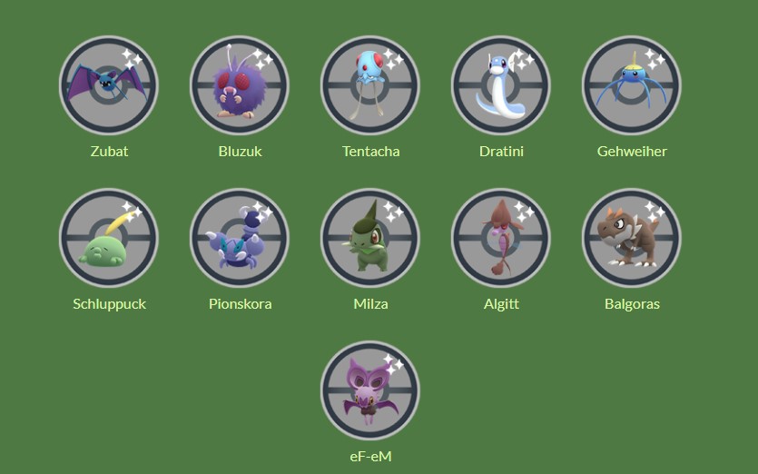 Feldforschungen: Wenn ihr Feldforschungen erledigt, die ihr während des Events erhaltet, dann könnt ihr dadurch Sleima*, Dratini*, Knacklion*, Algitt*, eF-eM* und Garstella begegnen.