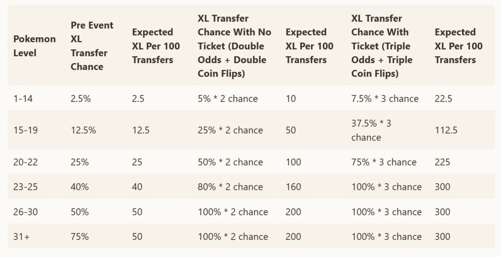 Ein Trainer auf Reddit hat eine Tabelle erstellt, in der ihr genau ablesen könnt, wie hoch die Chance auf XL-Bonbons beim Versenden ist. Diese ist außerdem abhängig vom Level des Monsters, welches ihr versendet.