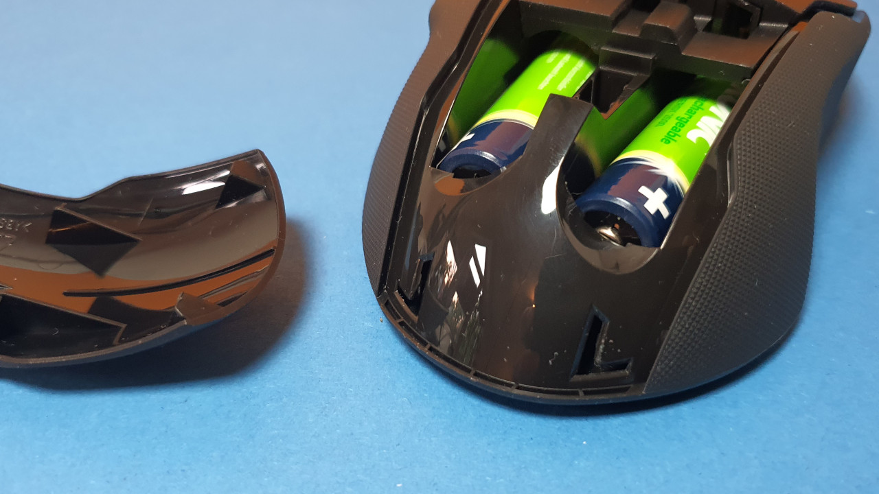 Eine Schwachstelle gibt es jedoch und das ist das Fach für die Batterien/Akkus. Die Klappe ist zum einen nur durch zwei dünne Plastiknoppen befestigt und es ist ein echter Krampf, die Klappe für das Fach wieder zu montieren. Wer jedoch nach jedem Tag den Dongle der Maus wider im Inneren verstauen möchte, dürfte damit langfristig keine Freude haben. Eine magnetische Halterung oder ein simpler Mechanismus wäre mir lieber gewesen.