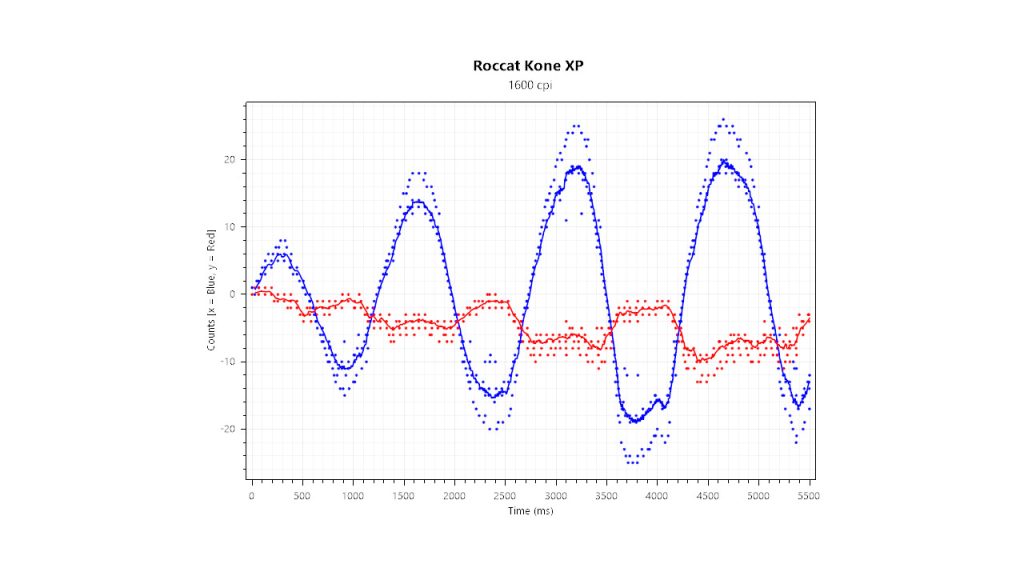 Große Sprünge gibt im Sensor-Test nicht, bei geraden Bewegungen bleiben die Messpunkte nah an der Kurve. Anders ist es, wenn die Bewegungen der Maus sehr schnell werden: Die Messpunkte bleiben gleichmäßig und orientieren sich an der Bewegung, aber es gibt auch immer wieder Sprünge, die der Sensor ausgleichen muss.