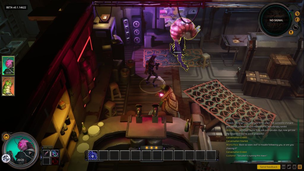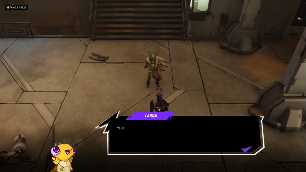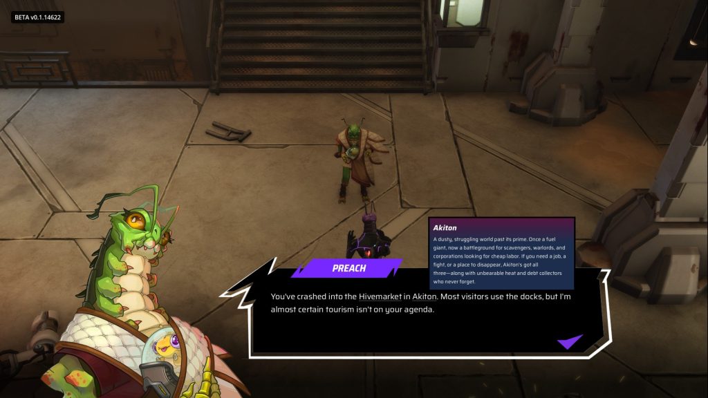Preach, eigentlich G’og N’o (samt einer putzigen, sehr aufgeweckten Larve), und Sterling. - Es gibt einen Tutorial-, einen Boss- und einen optionalen Kampf.