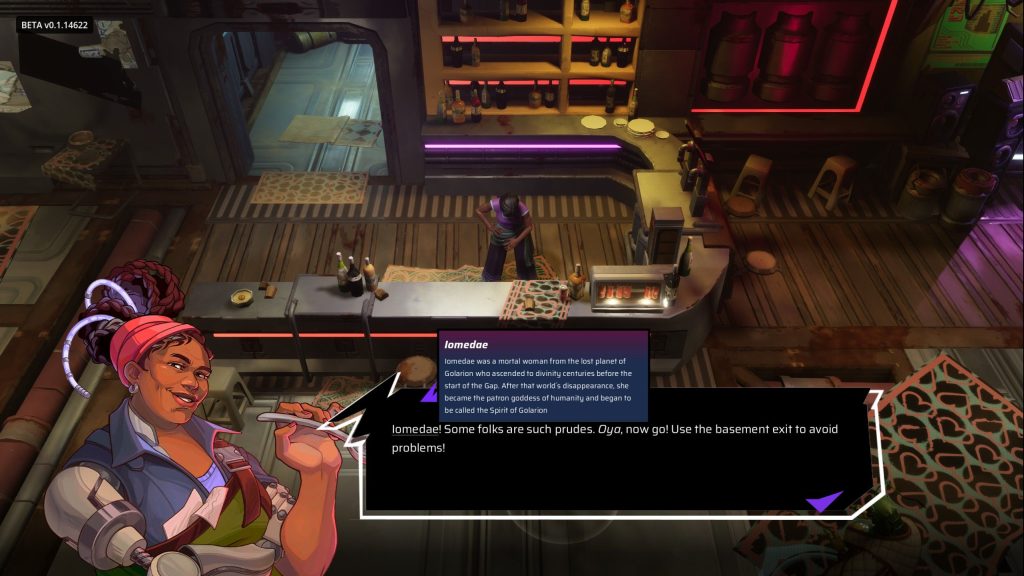 Bereits in einem der ersten Gespräche hat jedoch die Barkeeperin des Schuppens, in den ich direkt zu Anfang gehe, ein einziges Wort fallen lassen, das mich direkt hat aufschrecken lassen: Iomedae. Durch den Dialog habe ich mich durchgeklickt und nochmal neu angefangen, nur um sicherzugehen, dass ich richtig gehört habe.