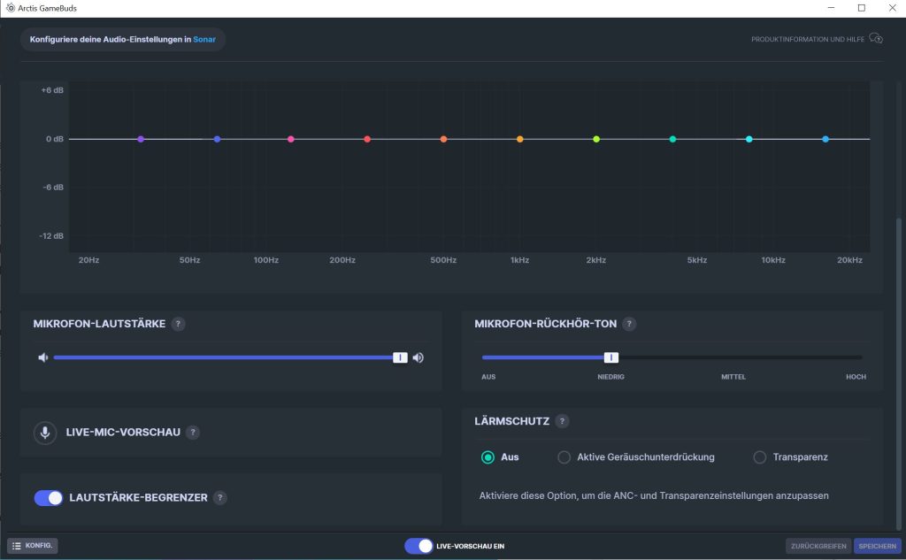 SteelSeries GG ist insgesamt mit zusätzlichen Features überfrachtet: Hauseigene Werbung, sogenannte „Gift Guides“, News über eigene Produkte und Giveaways werden alle in der Software angeboten. Die eigentliche Software, um die In-Ears zu konfigurieren, findet ihr erst in einem zweiten Tab. Habt ihr es bis hierher geschafft, ist der Rest übersichtlich.
