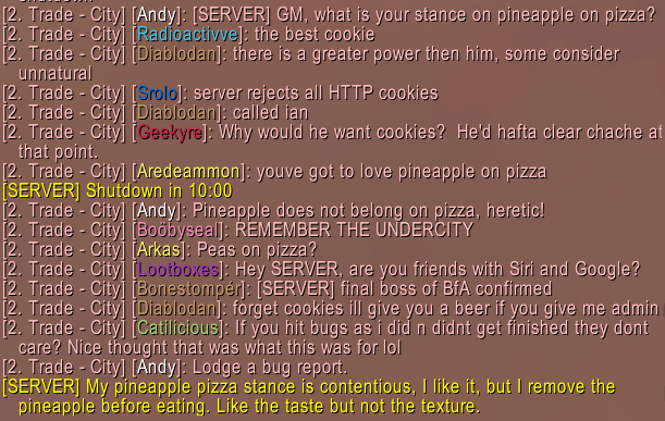 Auch in der ewig-währenden Debatte zur „Ananas-Pizza“, die im Handelschannel immer wieder aufflammt, geben die GMs gerne Mal ihre Meinung ab. Und wie kann man am besten beide Lager gegen sich aufbringen? Richtig, man ist einfach nicht eindeutig dafür oder dagegen und schreibt als Servermeldung: