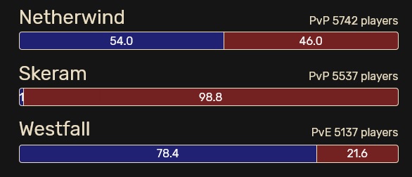 Um welchen Realm geht es? Die Rede ist vom US-Realm Skeram. Das Ungleichgewicht der Kräfte ist hier ausgeprägt und hat ein neues Extrem angenommen. Die Allianz kommt nur auf 1,2% der aktiven Charaktere, die Horde auf stattliche 98,8% laut der Seite ironforge.pro (Stand 04.05.2020). Oder anders ausgedrückt: Jeder Allianz-Spieler steht knapp 99 Horden-Spieler gegenüber.