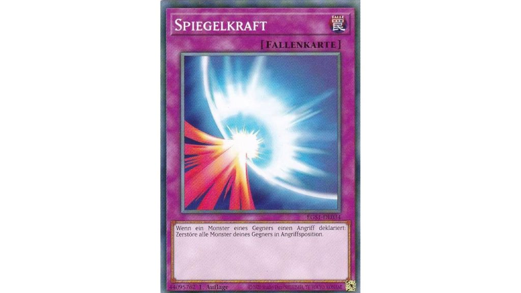 Es gibt auch Fallen- und Zauberkarten, mit denen ihr ein Monster ausrüsten oder sogar andere Effekte annullieren könnt. Eine tolle Fallenkarte ist unter anderem Spiegelkraft, wobei alle Monster in Angriffsposition ausgelöscht werden, wenn der Gegner euch angreift und ihr reagiert. Wenn euer Gegner keinen Konter besitzt, um den Effekt dieser Karte zu unterbinden, bekommt er ordentlich eins auf die Mütze.